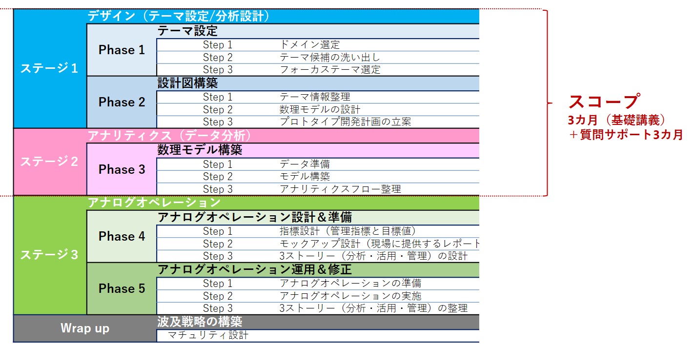 そのために、単にデータサイエンスの手法を覚えたり分析ツールを操作できるようになるなけでなく、以下にビジネス成果を出すのかというアプローチ方法から学んでいきます。