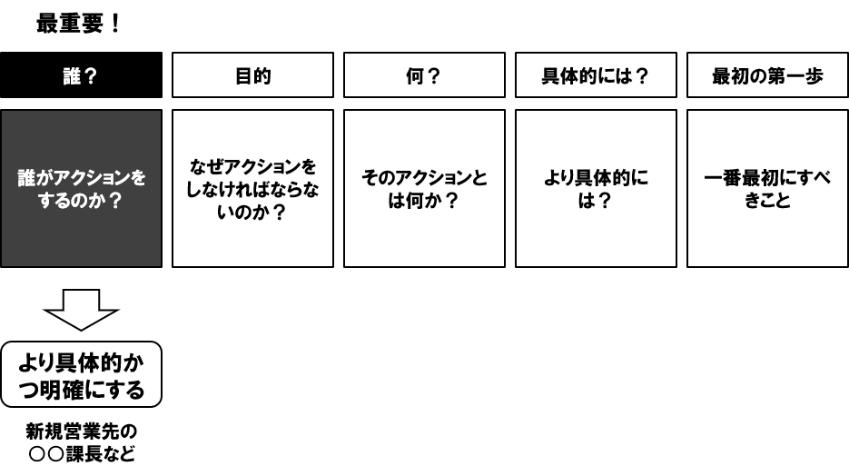 誰が行動するのか明確でないと、行動できないアクションを提示してしまう恐れがあります。