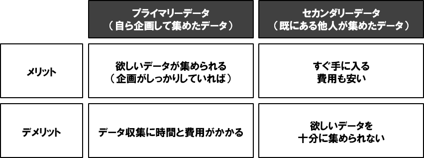 自ら企画したアンケートやヒアリング、自社の売上データやPOSデータなどはプライマリーデータです。