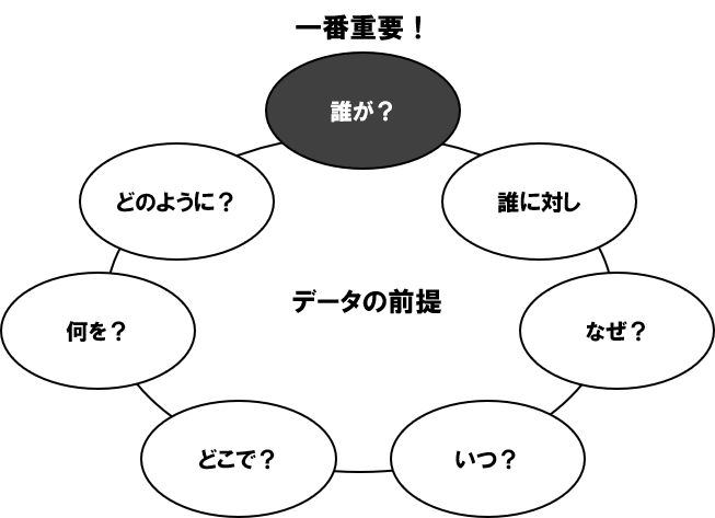 データの前提とは、データの履歴書です。7何(6W1H)で表現されます。