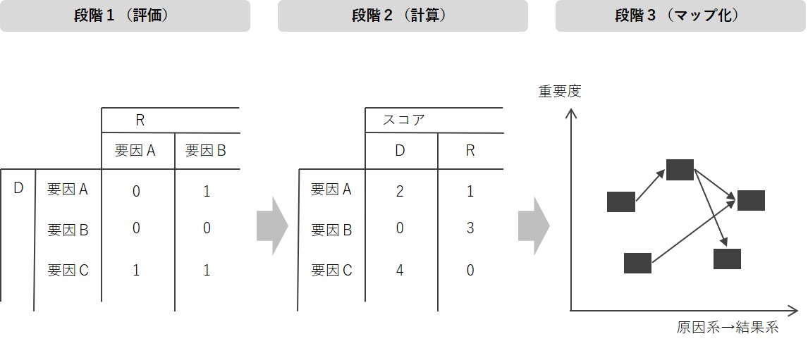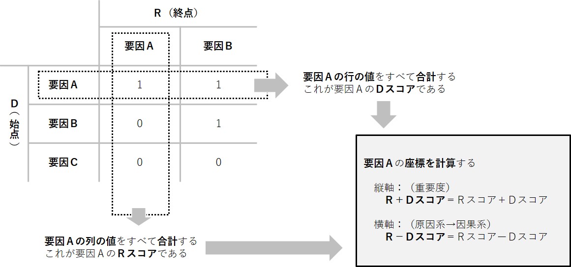 段階2の「計算」では、要因のそれぞれについて、始点としての影響度(Dスコア)終点としての影響度(Rスコア)を算出し、「R+Dスコア」と「R-Dスコア」を計算します。