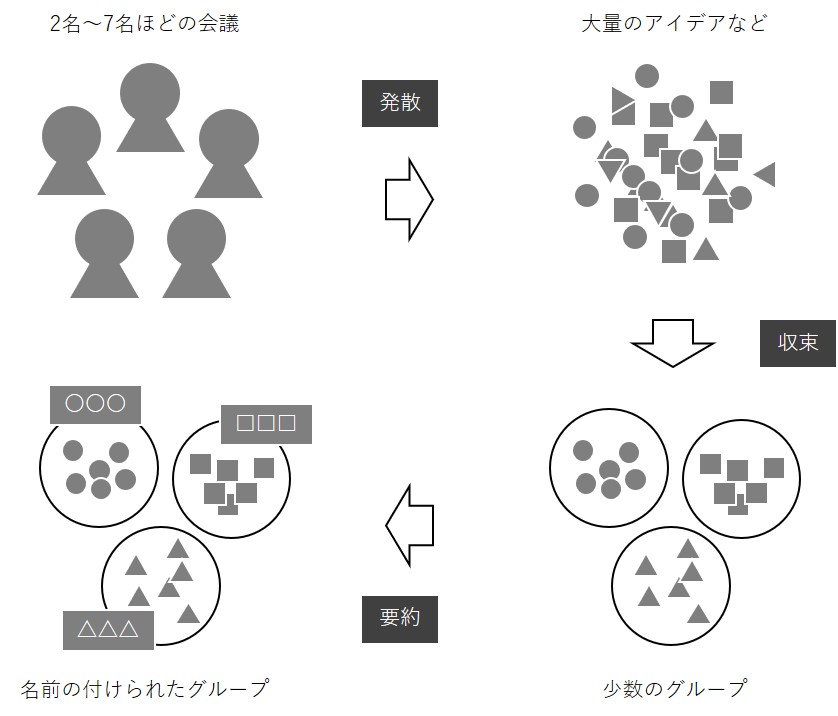 親和図法(KJ法)そのもののやり方は非常に簡単で、「発散→集約→要約」という流れになります。