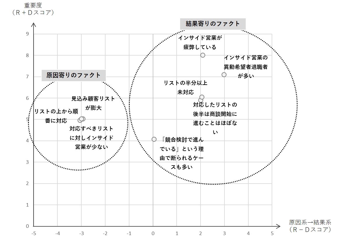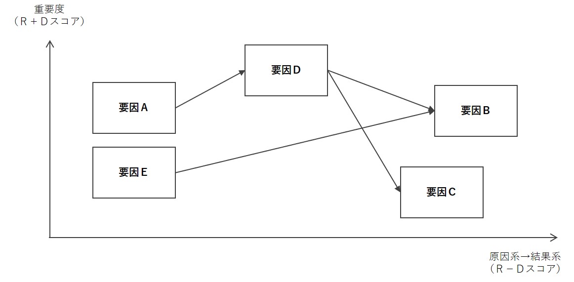 一方、「R-Dスコア」はその要因(ファクト)がどちらかというと「原因」になるのか、それとも「結果」になるかを表します。「R-Dスコア」が大きければその要因(ファクト)は「結果」の性格が強く、小さければ「原因」の性格が強いと解釈します。