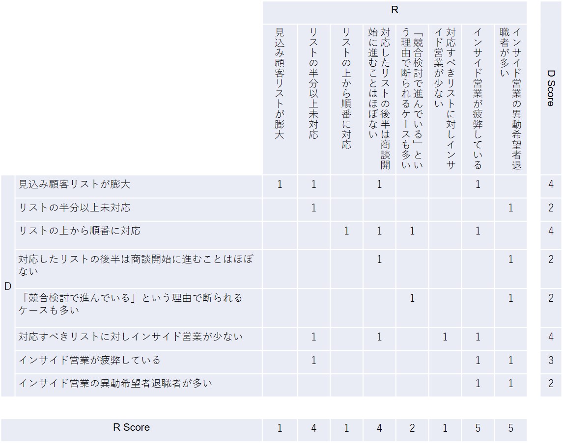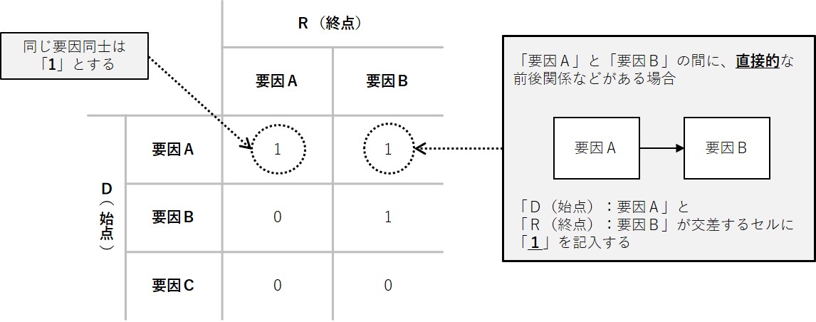 各要因間(今回の場合は「ファクト」間)に時間的な前後関係や因果関係といった直接的な関係性(始点と終点)が「あるのか? ないのか?」を評価します。始点をD終点をRと表現します。
