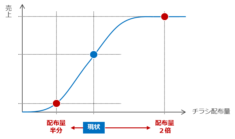 例えば、チラシに配布枚数と売上の統計モデルです。簡単に作れます。以下の図を使えば(実際は数式に当てはめて計算)、チラシ配布枚数を倍にしたらどうなりそうか、チラシ配布枚数を半分にしらたどうなりそうか、がシミュレーションできます。