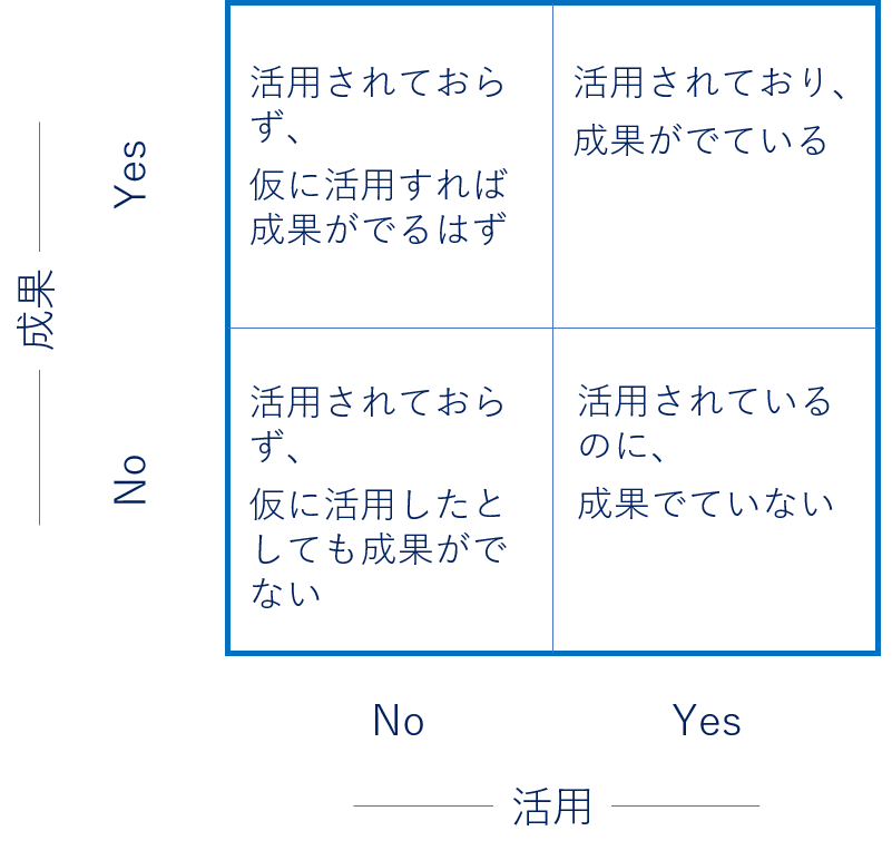 このとき、「活用×成果」のようにクロスさせることで、4つの可能性が考えられます。