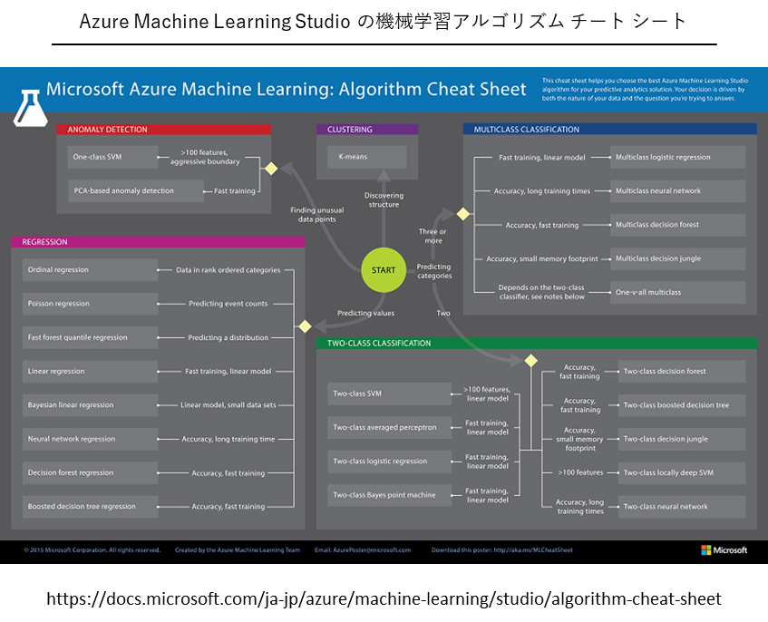 チートシート(カンニングペーパー)には幾つかありますが、もっともシンプルなものがMicrosoft社の次のチートシート(https://docs.microsoft.com/ja-jp/azure/machine-learning/studio/algorithm-cheat-sheet)です。