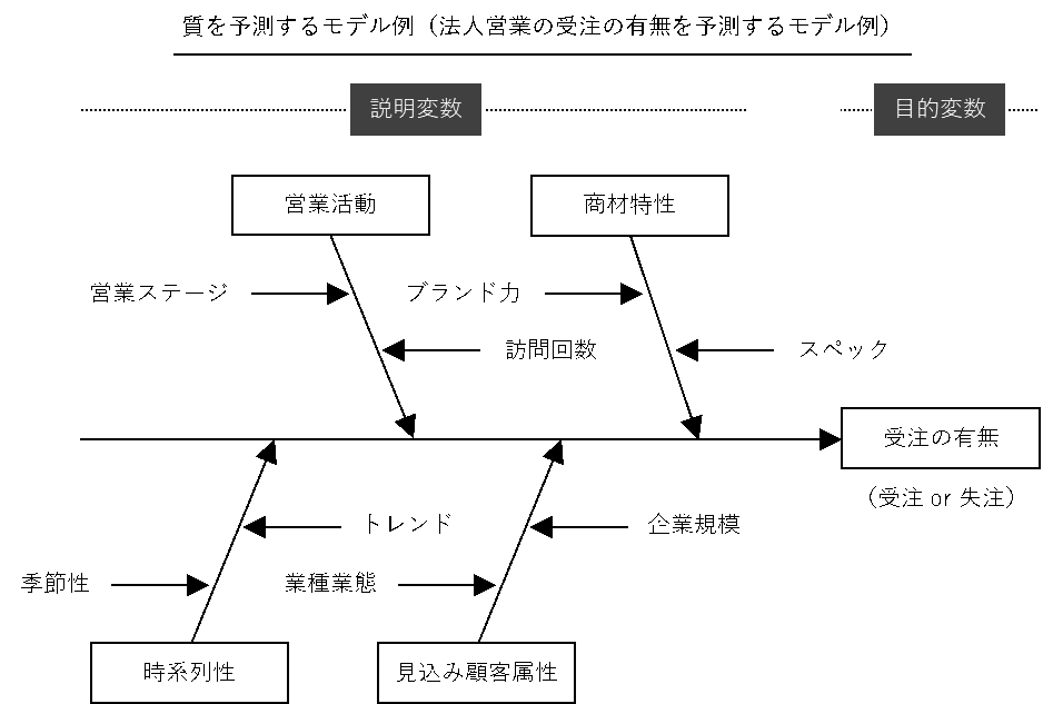 例えば、予測対象である「受注の有無」(受注 or 失注)を目的変数とし、受注に影響を及ぼす営業活動や顧客行動などを説明変数にします。