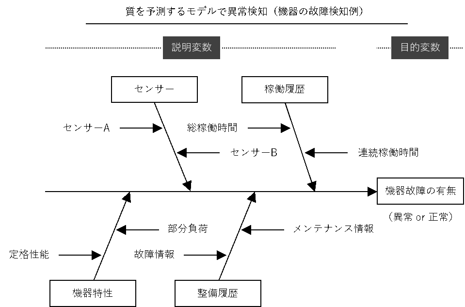 例えば、質を予測するモデルであれば、目的変数として「異常 or 正常」としモデルを構築することで、機械の故障の検知することができます。