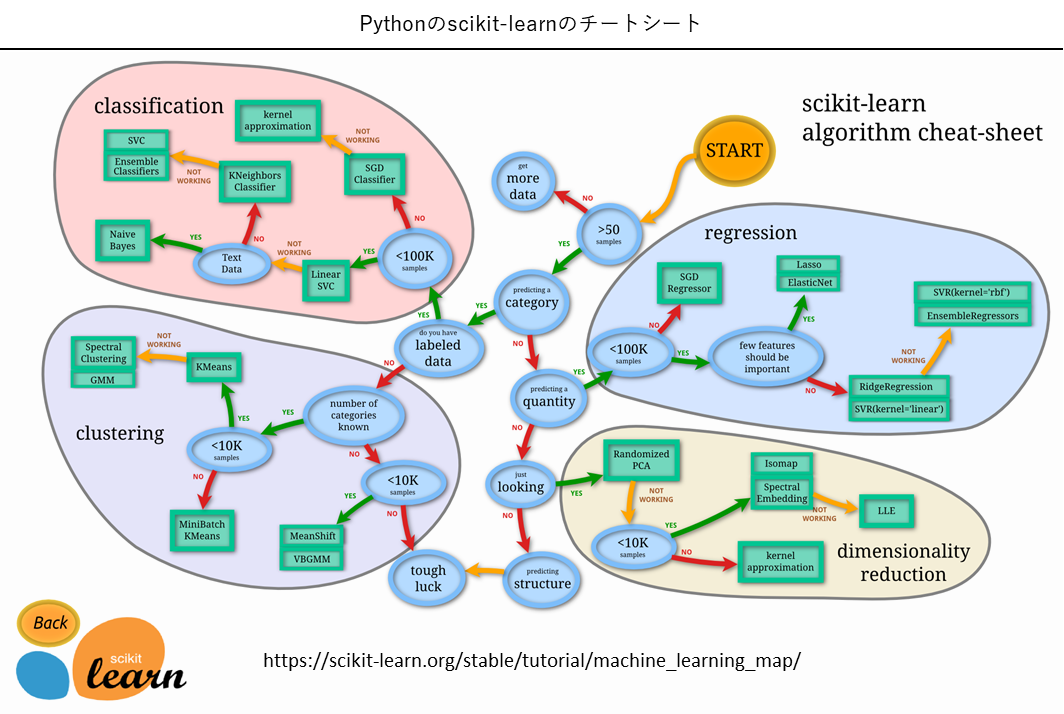 詳しくは説明しませんが、Microsoft社のチートシートは「用途」でモデルを選択する感じになっていたのに対し、Pythonのscikit-learnのチートシートは「データの状態」でモデルを選択する感じになっています。
