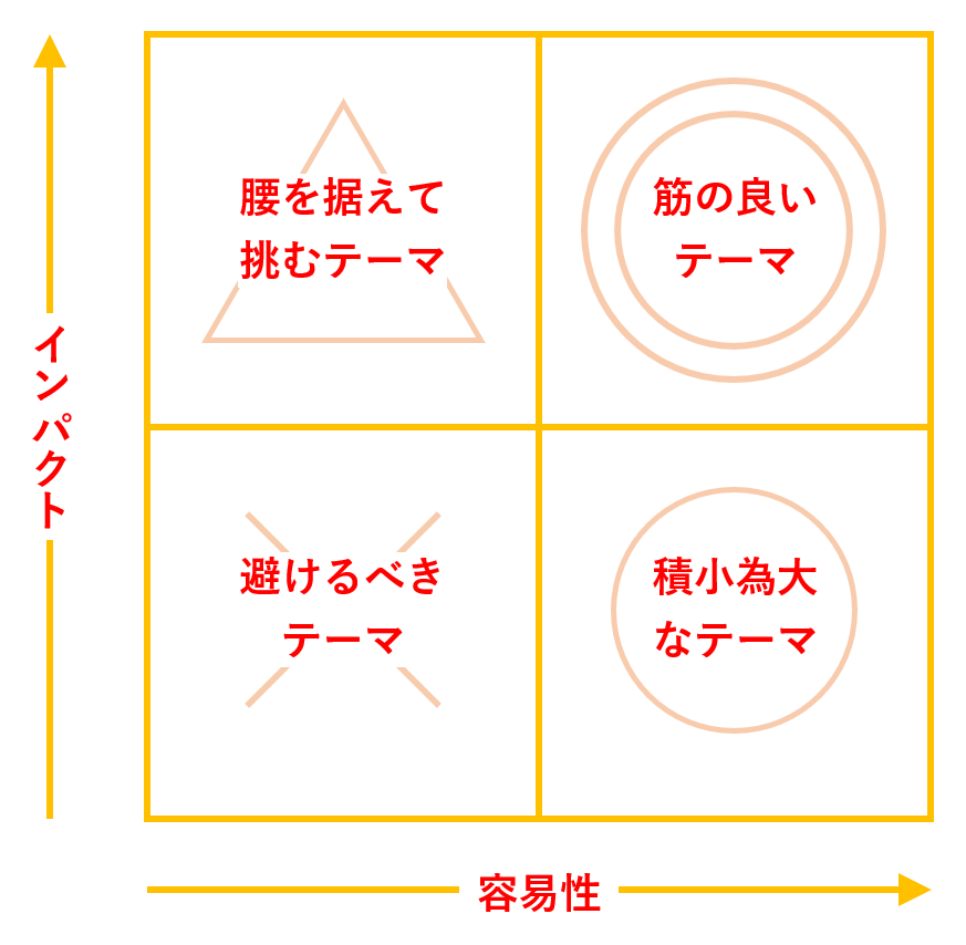 ちなみに、筋の良いテーマとは、効果が大きくやり易いテーマです。