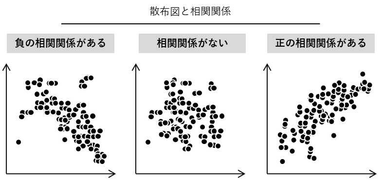 - +1に近いほど「正の相関関係がある」(一方が増加すると他方も増加する傾向にある場合)