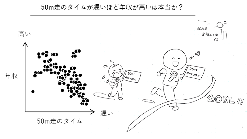 例えば、年収と50m走のタイムは正の相関があると言われています。