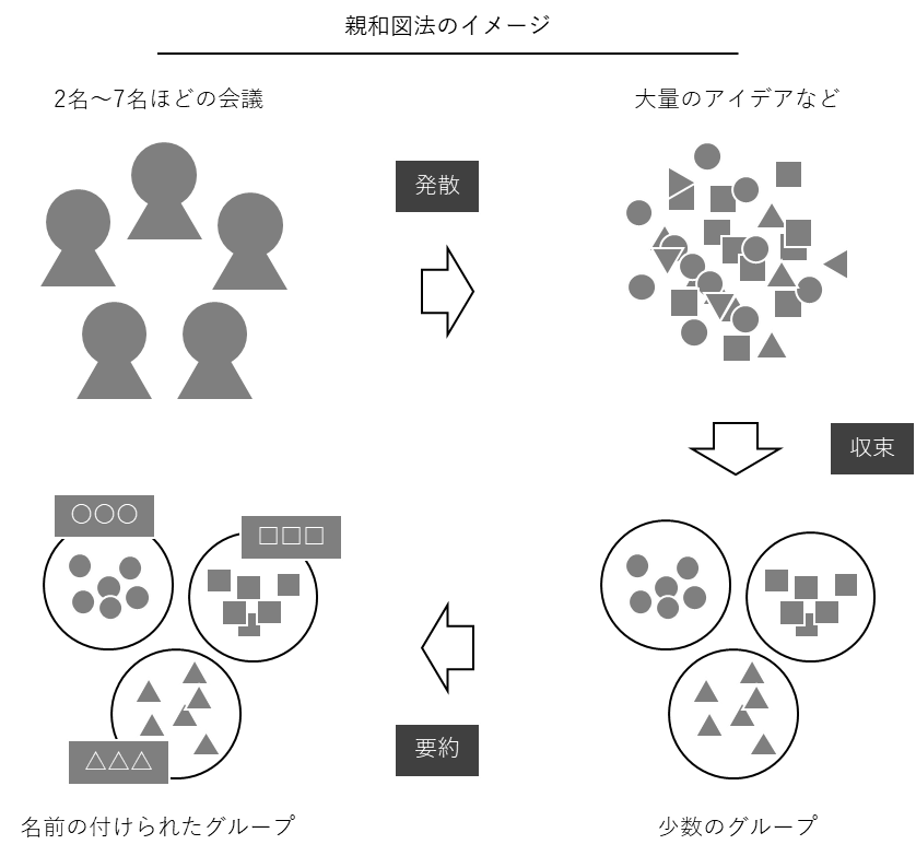 親和図法(KJ法)そのもののやり方は非常に簡単で、「発散→集約→要約」という流れになります。