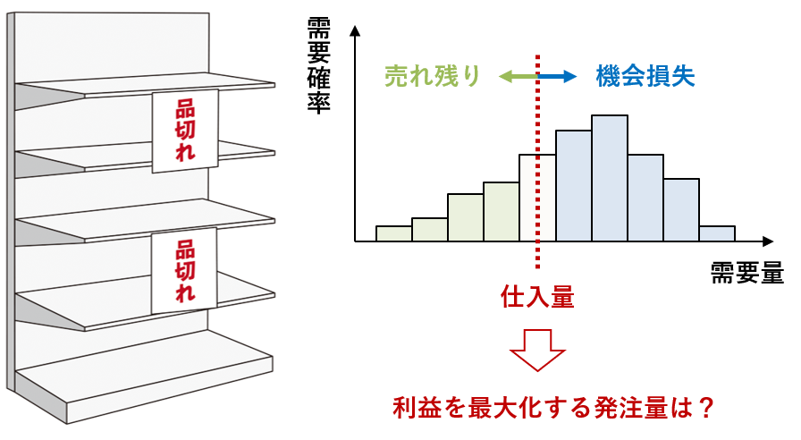 「新聞売り子問題」とは、古典的なデータ分析・活用の問題で、機会損失と売れ残りのバランスを考え、仕入れ量を決める問題です。