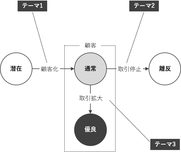 そういう意味では、典型的なテーマは3つ(新規顧客の獲得・既存顧客の離反阻止・既存顧客の取引額拡大)ではなく4つと言えるかもしれません。