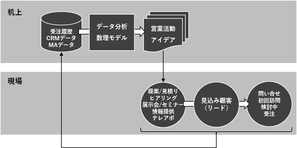 「机上」(アナリティクス業務)では、受注履歴やCRM(顧客関係管理システム)、MA(マーケティング・オートメーション・ツール)などのデータに対し、データ分析をしたり数理モデル構築をしたりするなどをし、分析結果や予測結果など現場で実施する営業活動アイデア(アクション案など)を導き出します。