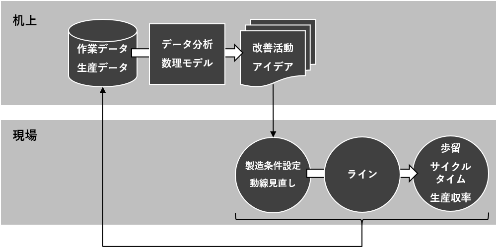 「現場」(データ分析・活用(データサイエンス実践)を実践する現場)では、「机上」で導き出された分析結果や予測結果など現場で実施する改善アイデア(アクション案など)をもとに、生産管理や工員などが抱えている歩留まり(良品の割合など)やサイクルタイムに関する課題に対し、実施する改善活動(アクション)を検討し実行します。その結果、歩留まり(良品の割合など)やサイクルタイムなどに変化は生まれます。