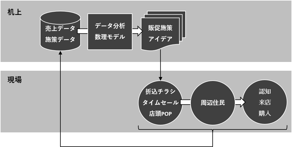 「現場」(データ分析・活用(データサイエンス実践)を実践する現場)では、「机上」で導き出された分析結果や予測結果など現場で実施する施策アイデア(アクション案など)をもとに、広告宣伝部と販売促進部、各店舗の店長などが連携しながら実施する施策(アクション)を検討し実行します。その結果、店舗のある周辺住民から何かしらの反応を得られます。