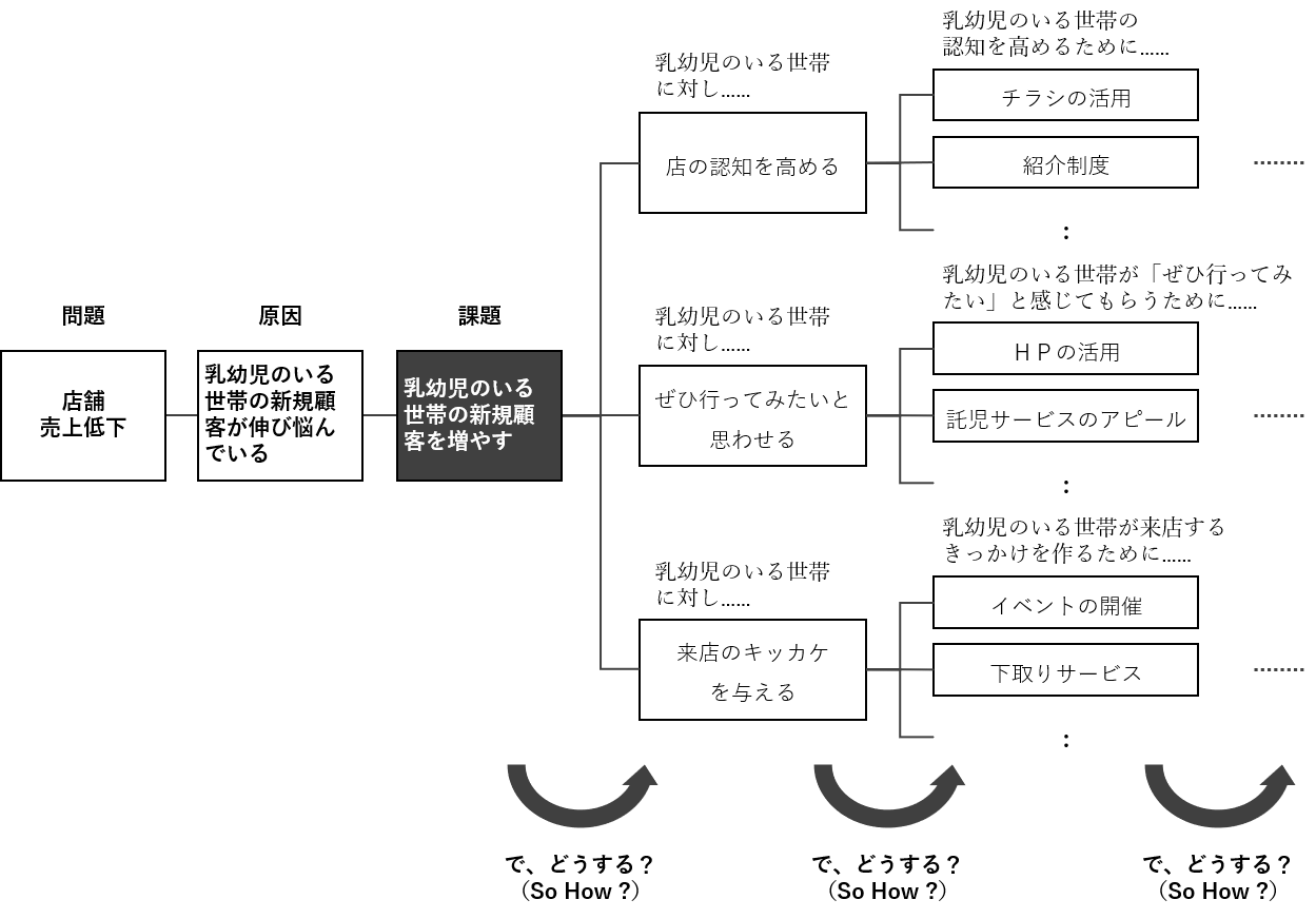 系統図法で問題を課題化し解決策を考える流れ
