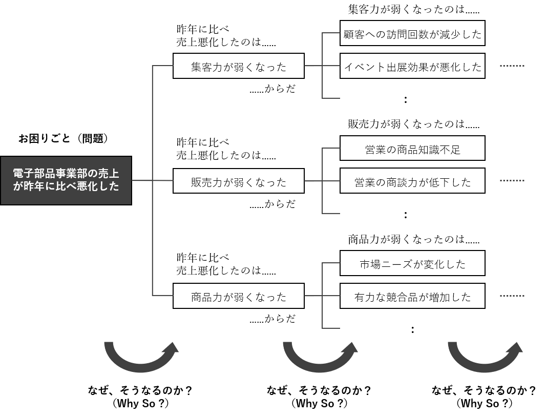【2】および【4】で系統図(ロジックツリー)を作り検討していきます。