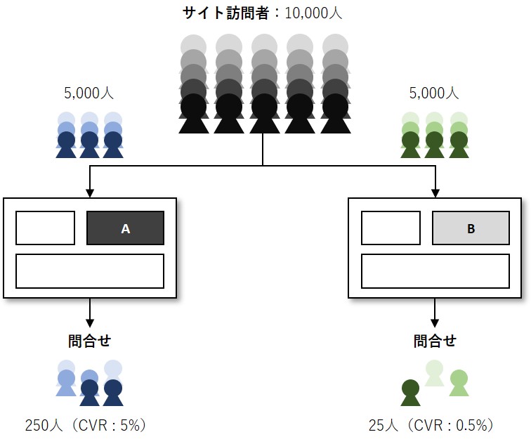 例えば、元のランディングページを見せるサイト訪問者を「対照群」、新しいランディングページを見せるサイト訪問者を「処理群」、処理群と対照群を比べて問い合わせや購入などの割合であるCVR(コンバージョンレート)が異なるかどうかを検討します。
