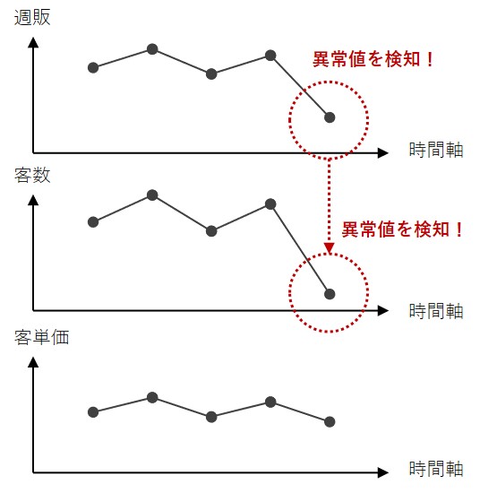 多くの場合、時系列データを折れ線や棒グラフで表現しモニタリングするようです。そこで、登場するのが異常検知というデータ活用です。モニタリングしている数字の異常を検知してくれます。