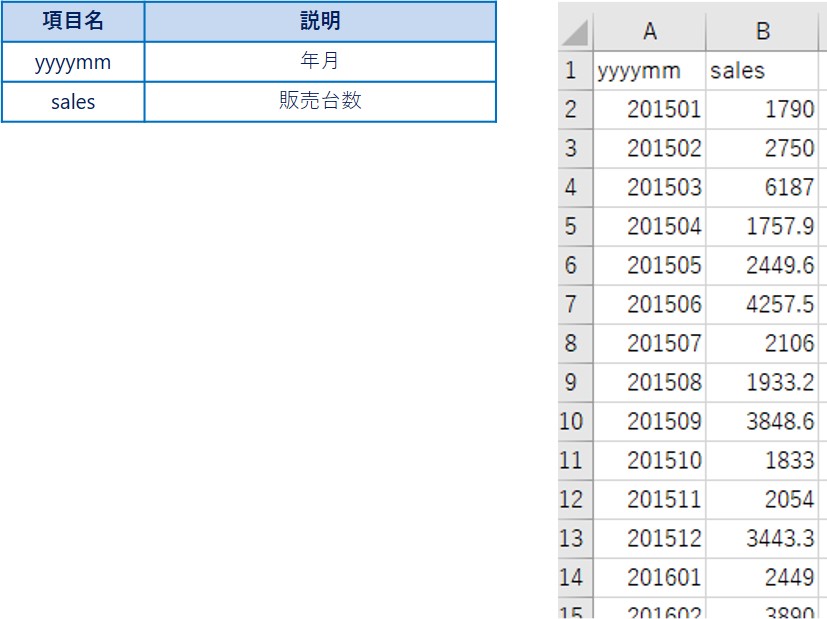 例えば、次のような1変量のデータ(例では、月別の乗用車の販売台数)でも、できます。