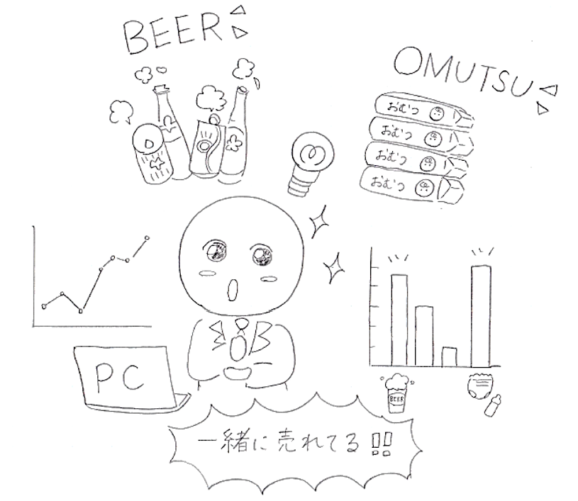 「ビールおむつ事例」とは、併売分析をしたらビールとおむつが併売されていた、ということがデータから新たに発見されたという面白事例です。