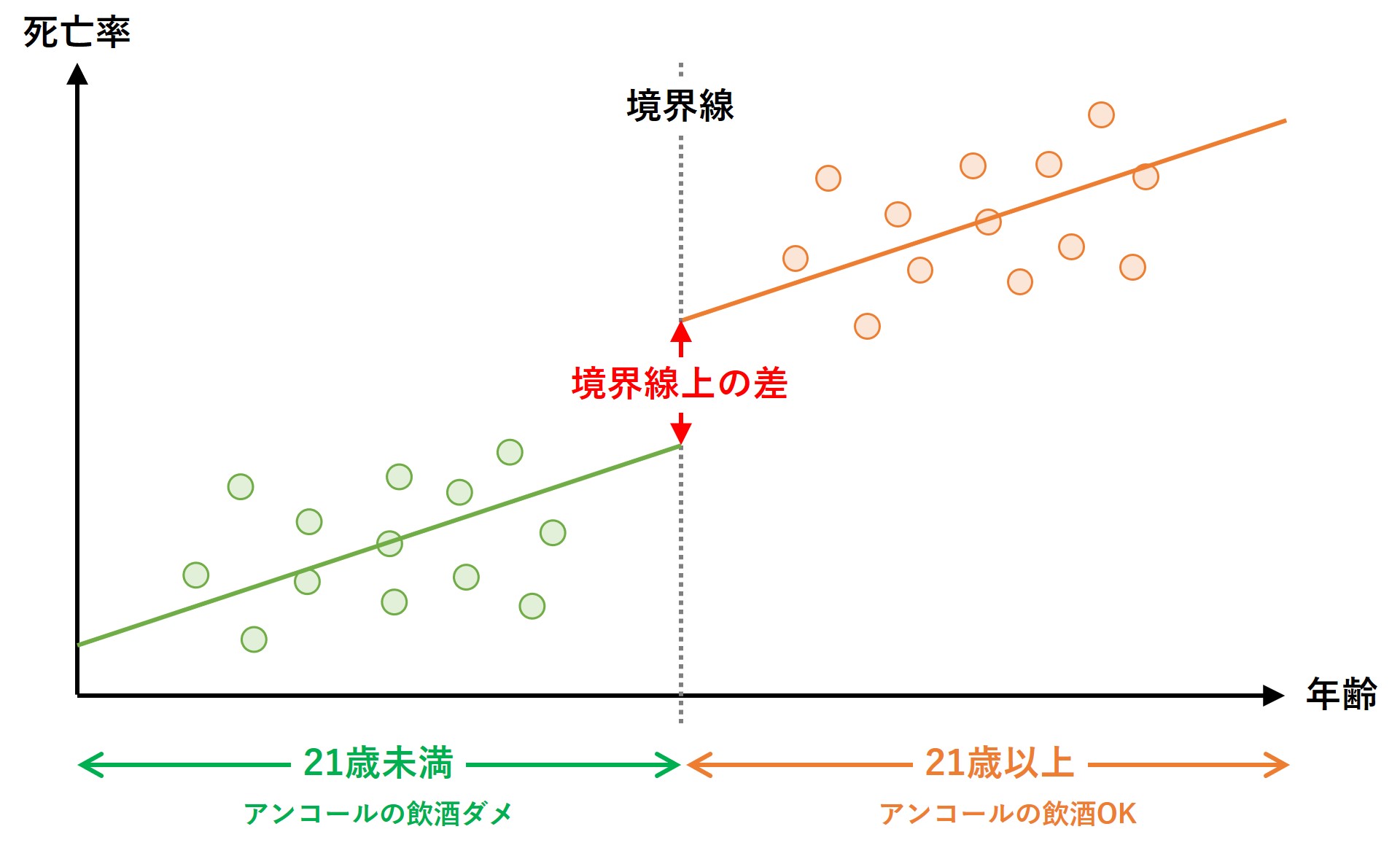 この仮定が満たされれば、21歳の誕生日(境界線)の前後で死亡率に違いがあれば、それは飲酒による影響に違いない、と考えます。