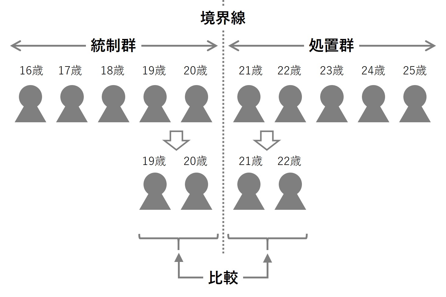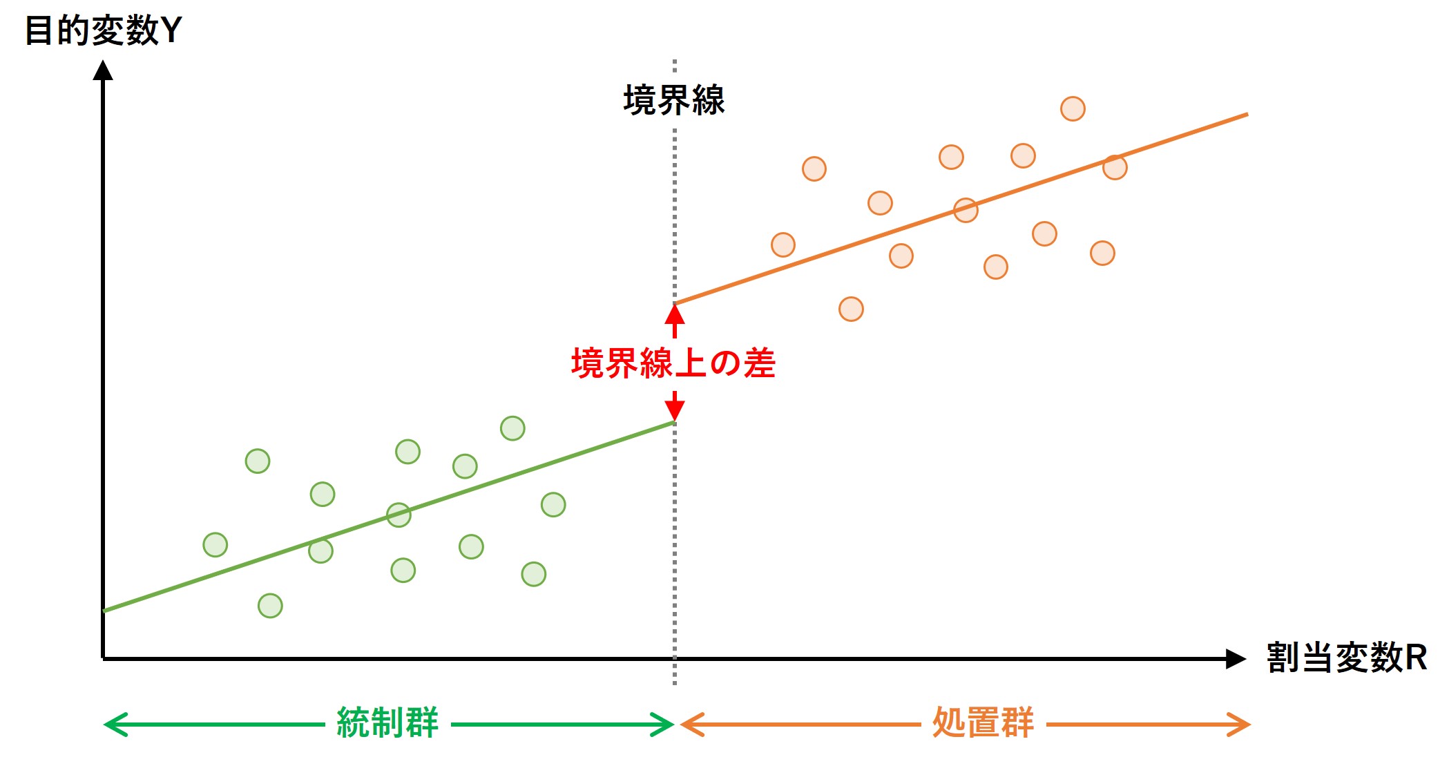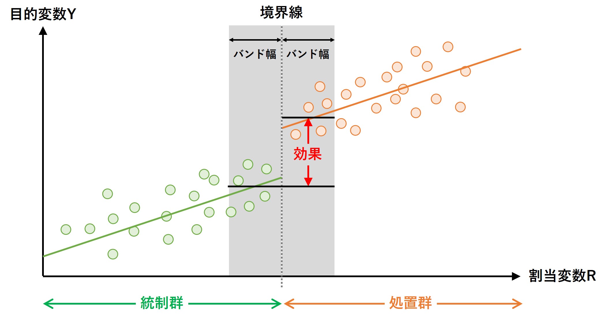 境界線付近の個体(人)は、ほぼ同じような人でしょう。そのため、処置群と統制群は境界線に近い場合のみ「ほぼ同じ」と仮定し、比較・分析をします。