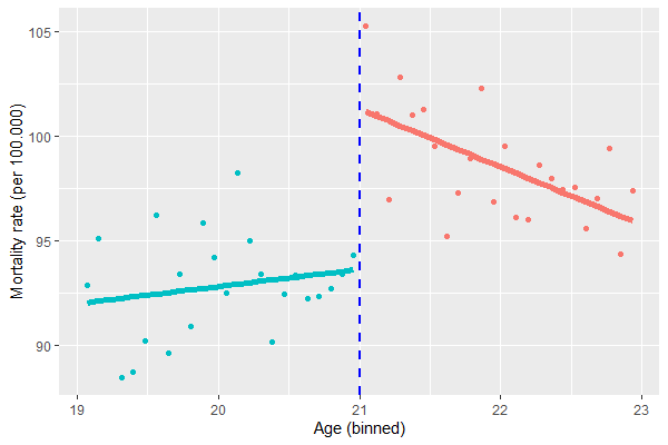 回帰不連続デザイン(RDD)の説明でよく登場する例で説明します。以下の参考文献にある、法定飲酒年齢が死亡者数に与える影響を分析した例です。