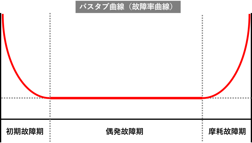 機械やシステムなどの故障率と時間の関係性を表現したのものに「バスタブ曲線」というものがあります。