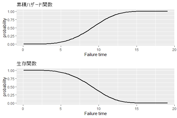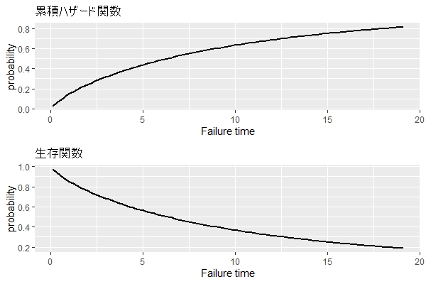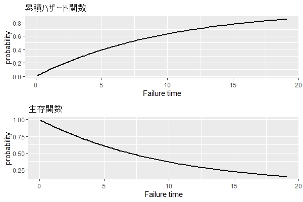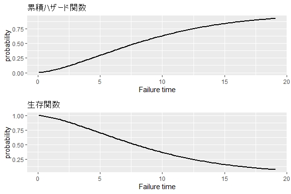 ちなみに、このワイブル分布の累積ハザード関数(その時間までに故障する確率)、生存関数(その時間までに故障しない確率)です。