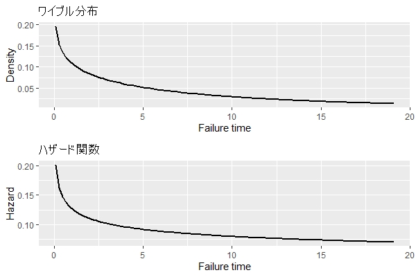 以下は、形状パラメータ(shape)が1より小さいときのワイブル曲線(寿命分布)とハザード関数(故障曲線)です。