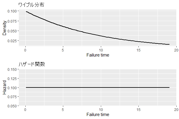 以下は、形状パラメータ(shape)が1のときのワイブル曲線(寿命分布)とハザード関数(故障曲線)です。