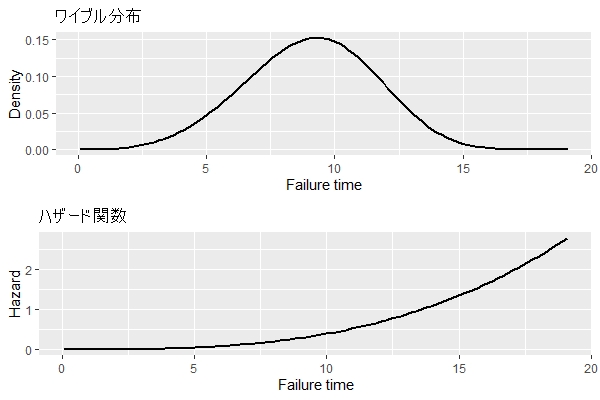以下は、形状パラメータ(shape)が1より大きいときのワイブル曲線(寿命分布)とハザード関数(故障曲線)です。