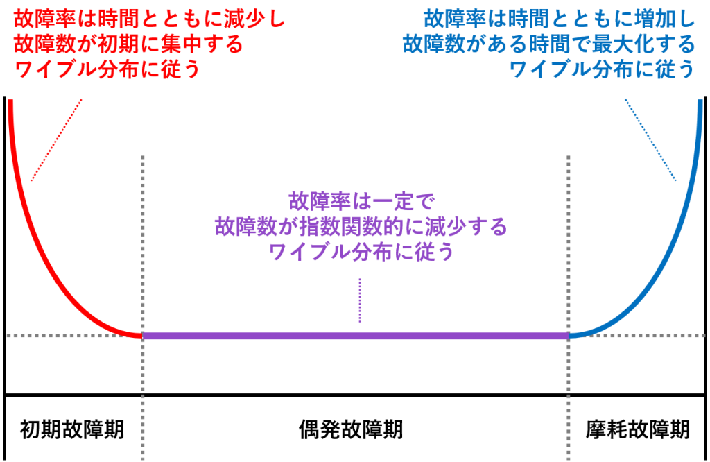 先ほどお話ししたとおり、バスタブ曲線は故障率の曲線で、「初期故障期」「偶発故障期」「摩耗故障期」の3つの期間に分けられ、それぞれで別のワイブル分布(とハザード関数の組み合わせ)になっています。