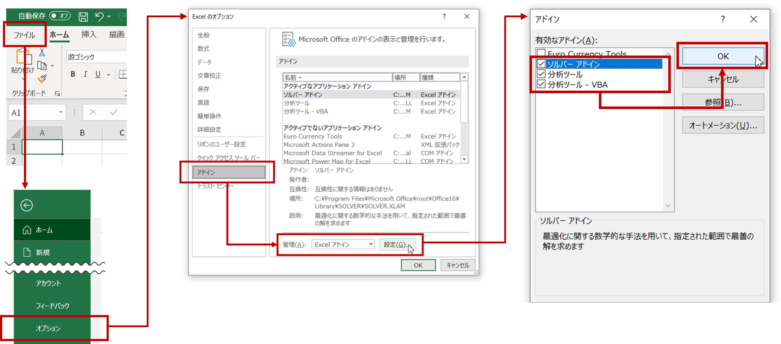 - Excelアドイン「データ分析」(+「ソルバー」)