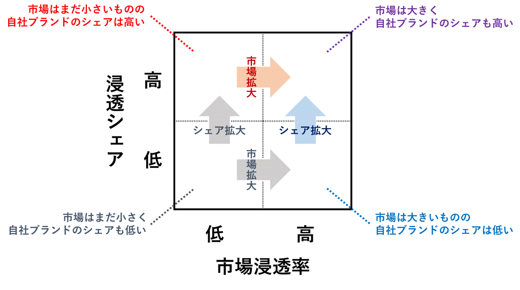 また、市場浸透率が十分大きいのに、相対的にブランド浸透率が小さい場合、その市場内で競合から奪い取る必要が出てきます。