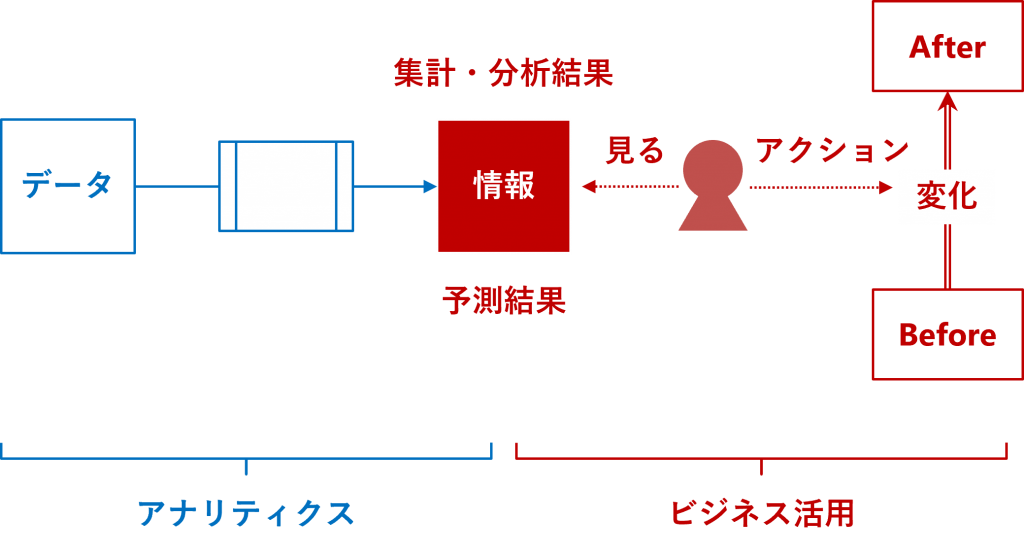 データが情報(データ分析や予測結果など)に変わり、情報(データ分析や予測結果など)がビジネス成果(Before→After)に変わる、この流れがデータ活用ストーリーです。