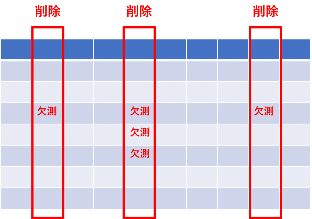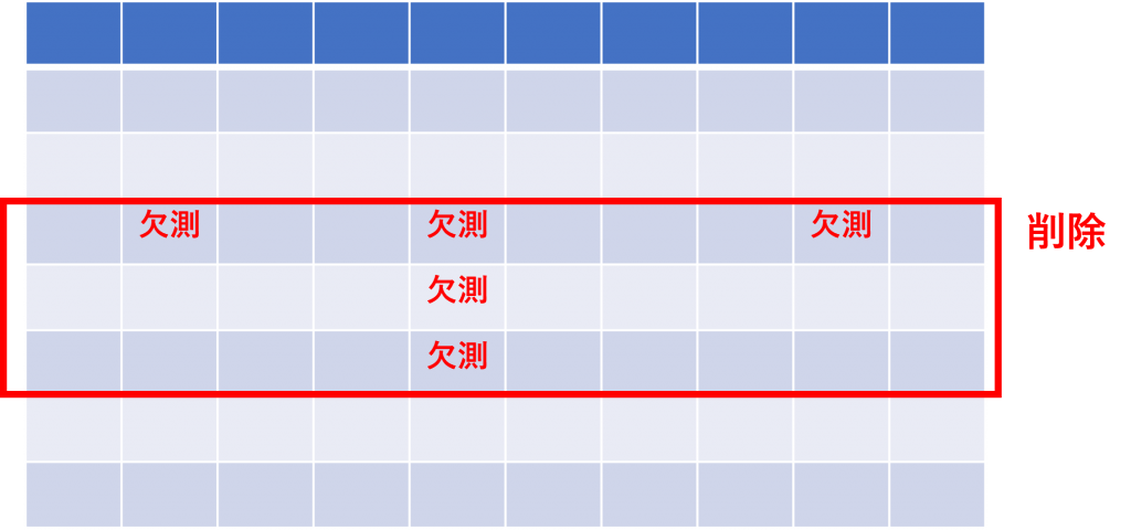 あるレコードに対し、欠測値が多い場合、そのレコードそのものを削る方略が「欠測値のあるレコードを削除する」という方略です。