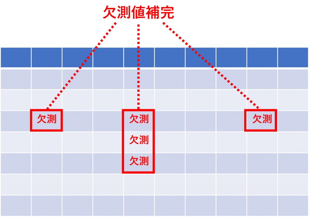 平均値代入法とは、平均値を計算し、その平均値で欠測値補完します。