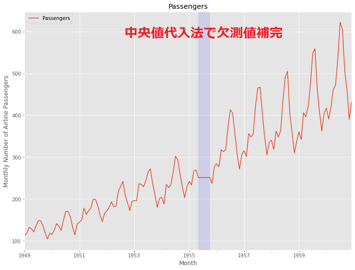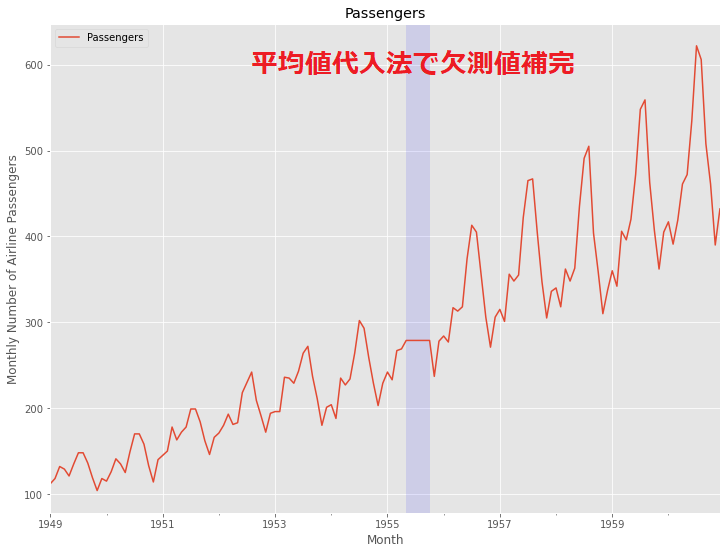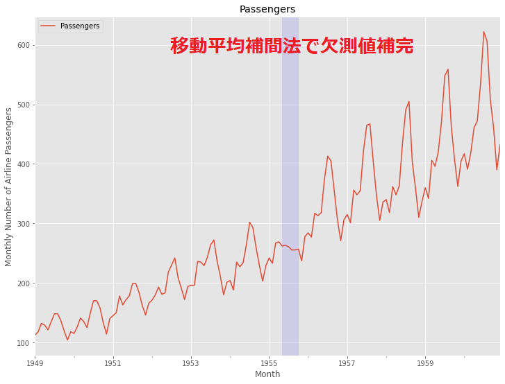 移動平均補間法とは、移動平均値を計算し、その平均値で欠測値補完します。
