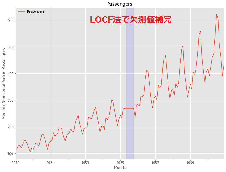 LOCF(Last Observation Carried Forward)法とは、欠測している状態より前のデータの中から、最後に観測された値(例では、1955年4月の値)を使って欠測値補完されます。