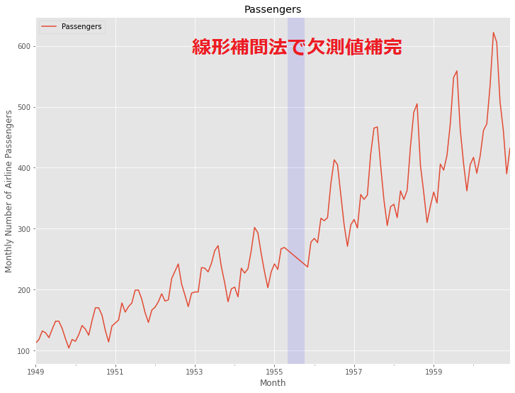 直線(1次関数)を使い欠測値補完をするのが、線形補間法です。
