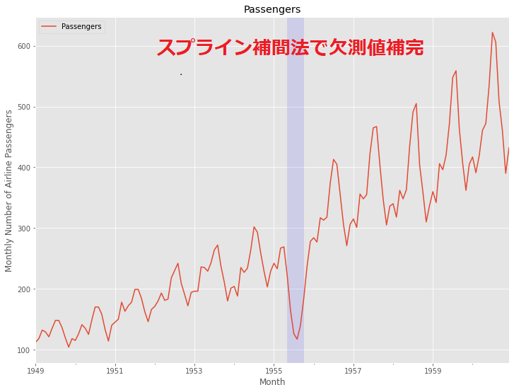 1次間数や2次関数などではなく、スプライン関数を使い欠測値補完をするのが、スプライン補間法です。