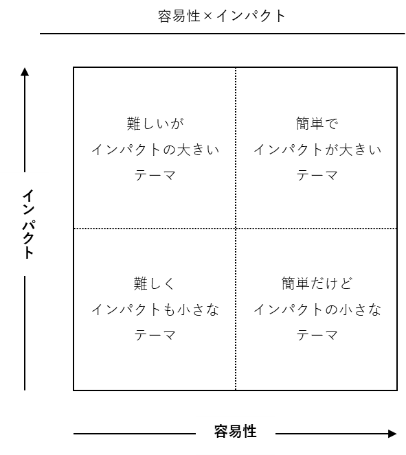 テーマを選定するとき、「容易性×インパクト」の掛け算で考えていきます。