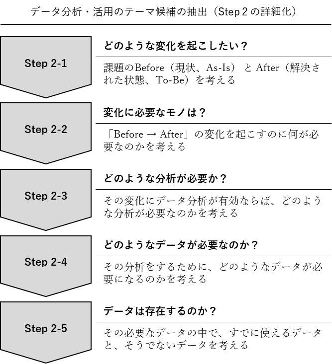 「Step 2-4」でどのようなデータが必要なのかを考え、「Step 2-5」でそのようなデータが存在するのかを検討していきます。