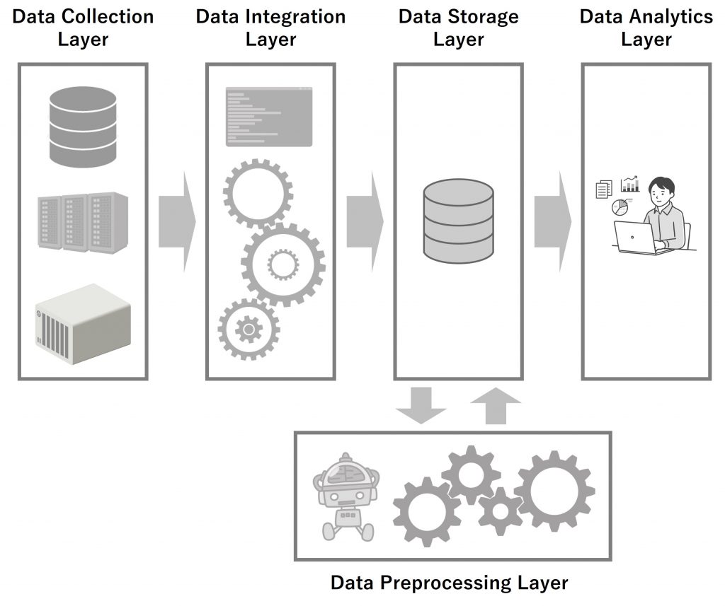 データも同じで、統合レイヤーからストレージレイヤーに流れてきたデータ対し、データ活用する人などが使いやすいように一手間二手間加えます。それが前処理です。